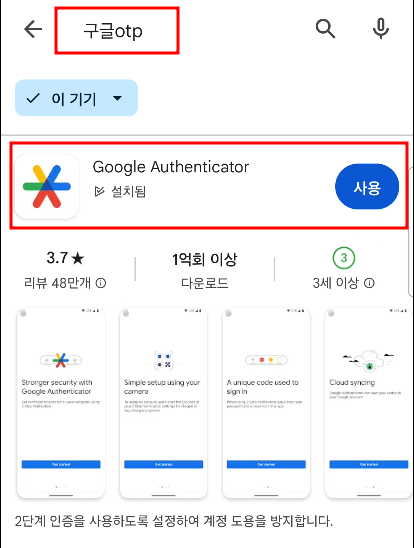 다음으로 구글플레이 혹은 앱스토어에서 '구글otp'를 검색 후 'Google Authenticator'이라는 어플을 다운로드하여 실행시켜 주세요.