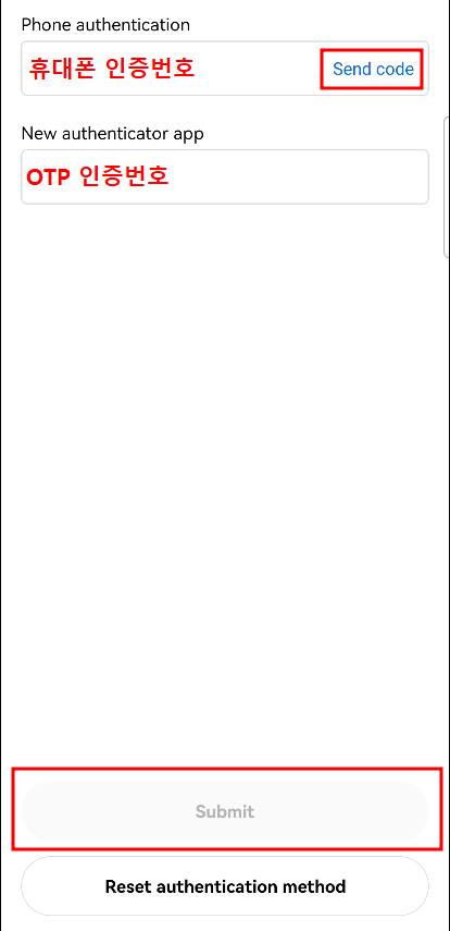 'Send code'를 눌러 휴대폰으로 전송된 인증번호와 구글 OTP 어플에서 복사한 인증번호를 붙여 넣기 해준 뒤 'Submit' 버튼을 눌러주면 보안인증이 완료됩니다.