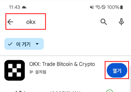 구글플레이 혹은 앱스토어에서 OKX 어플을 검색 후 다운로드하여 실행시켜 주세요.