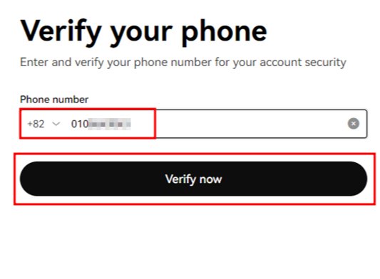 다음 휴대폰 인증을 하는 창이 나옵니다. 휴대폰 번호를 입력하고 'Verify now'를 눌러준 후 인증번호를 입력해 줍니다.