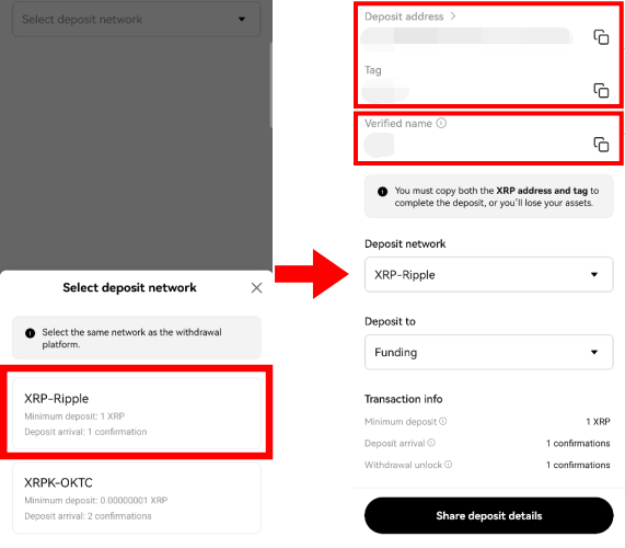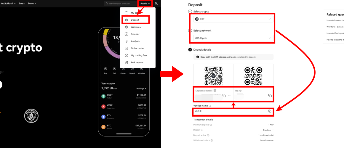 다음으로 XRP-Ripple 선택 -> 'Verfied name'에 본인 이름을 입력하고 'Deposit address'와 'Tag'를 복사해 줍니다.