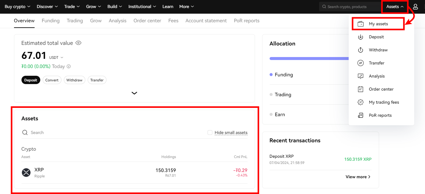 오른쪽 상단의 'Assets' -> 'My assets'을 눌러 들어가셔서 'Assets'칸을 보시면 입금된 코인을 확인하실 수 있습니다.
