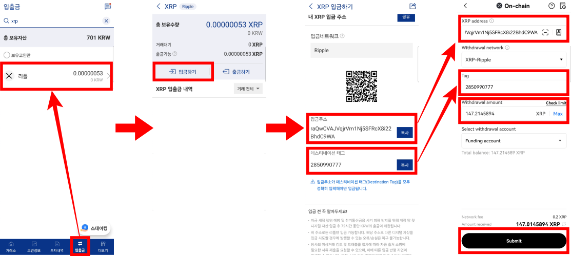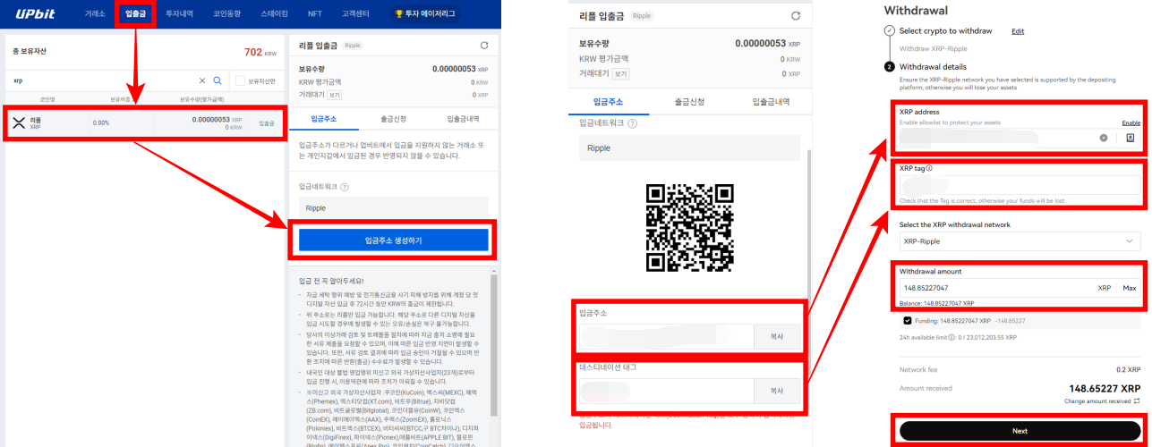 업비트 어플로 들어가 하단의 '입출금' -> '리플' -> '입금하기'를 눌러줍니다. 입금 주소와 데스티네이션 태그를 복사하여 다시 OKX로 돌아가줍니다.