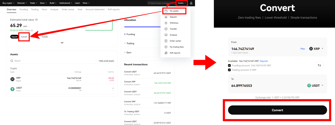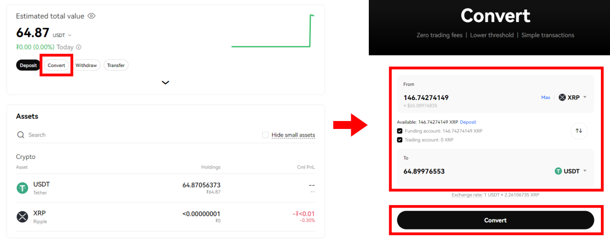 자신의 지갑화면('Assets->My asstes')에서 Convert를 눌러 FROM=XRP, TO=USDT로 설정 후 변환할 리플 수를 넣은 뒤 Convert 눌러 변환을 해줍니다.