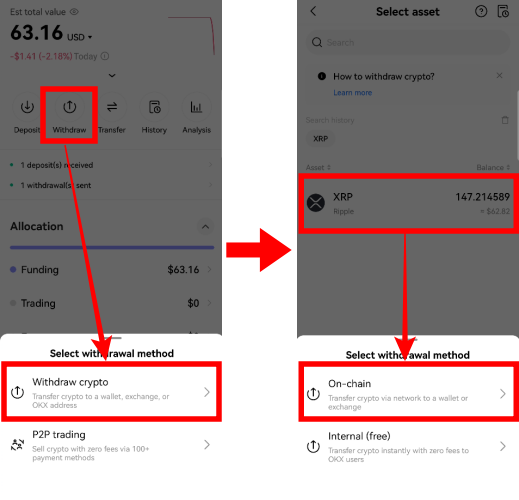 지갑 화면에서 'Withdraw' -> 'Withdraw crypto'를 누른 뒤 'XRP' -> 'On-chain'을 눌러줍니다.