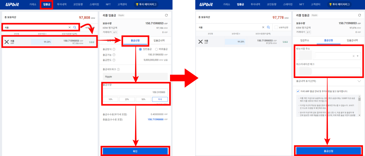 상단의 입출금을 누른 뒤 '리플'을 검색하고 눌러줍니다. 다음으로 출금신청 -> 출금수량 지정 -> 확인 순으로 눌러줍니다.