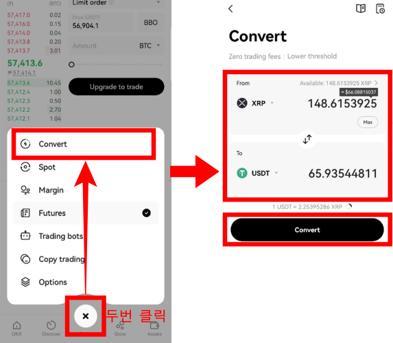 가운데 하단의 'Trade'를 두 번 눌러 나오는 목록에서 'Convert'를 누른 뒤 'XRP'로 변환할 수량을 입력 후 'Convert'를 눌러 줍니다.