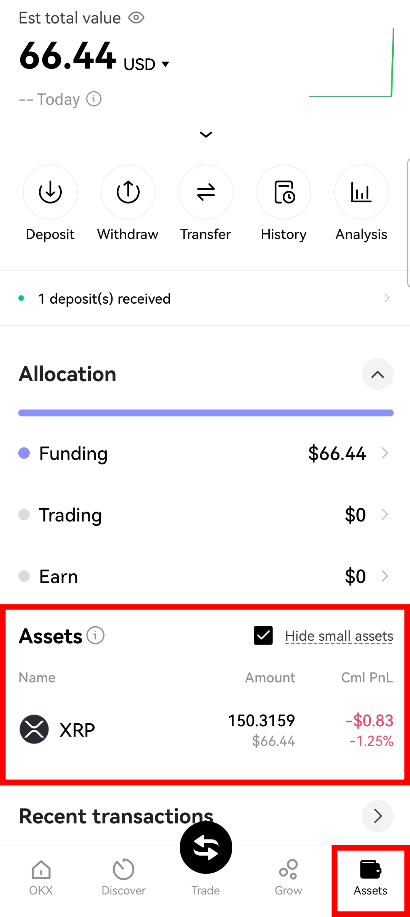 오른쪽 하단의 'Assets'을 눌러 들어가셔서 'Assets'칸을 보시면 입금된 코인을 확인하실 수 있습니다.