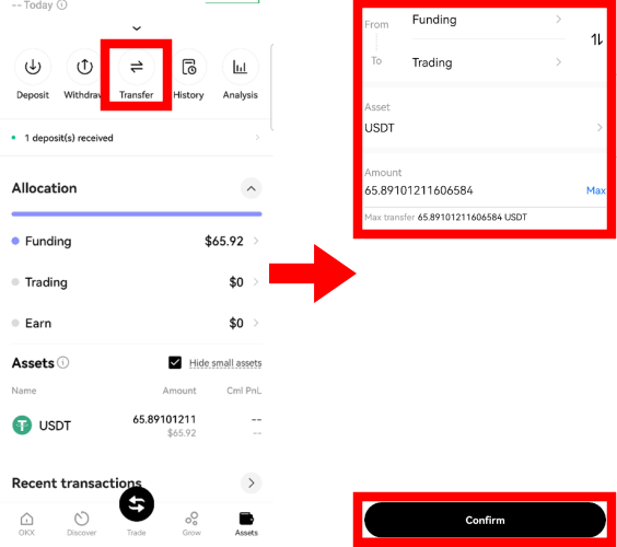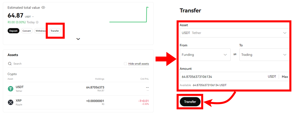 다음 본인의 지갑화면(하단 왼쪽의 Assets버튼)으로 가 'Transfer'를 누른 후 'Funding->Trading'으로 맞추고 변환할 수량 입력 후 'Confirm'을 누르면 완료됩니다.