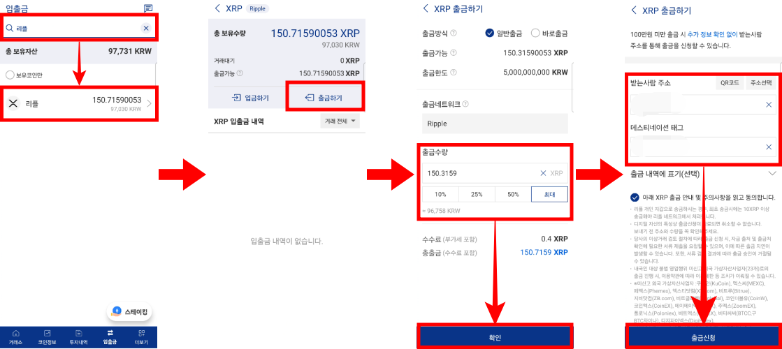 하단의 입출금을 누른 뒤 '리플'을 검색하고 눌러줍니다. 다음으로 출금하기 -> 출금수량 지정 -> 확인 순으로 눌러줍니다.