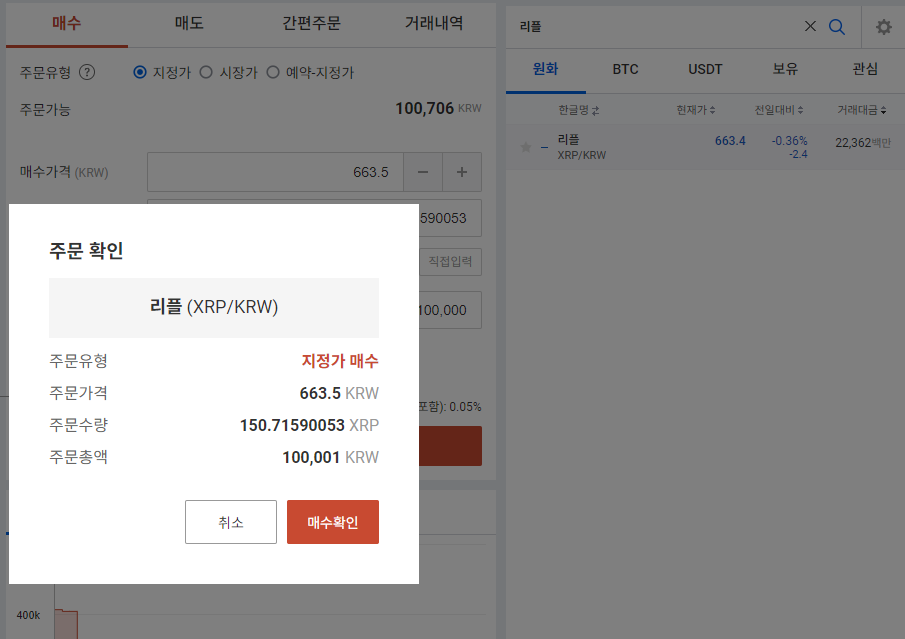 국내 거래소에서 전송을 원하는 만큼 리플을 매수해 주세요.