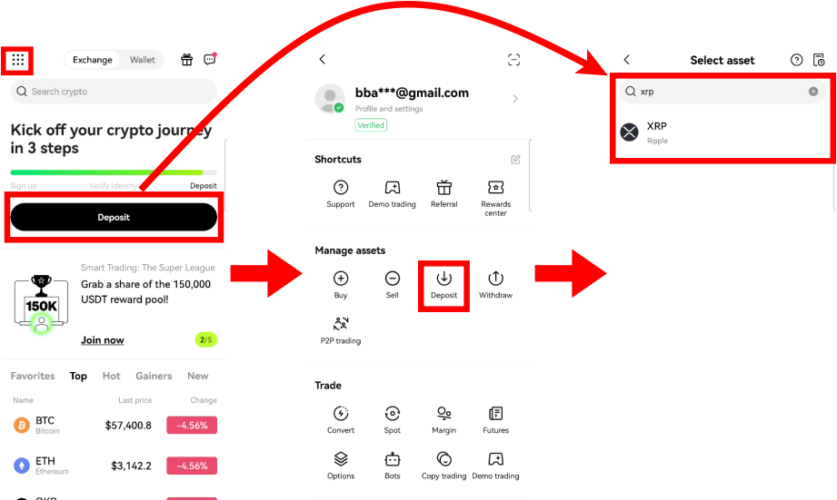 우선 OKX 어플 접속 후 로그인을 하고, 왼쪽 상단 '사각형 점' -> 'Deposit' 눌러줍니다.