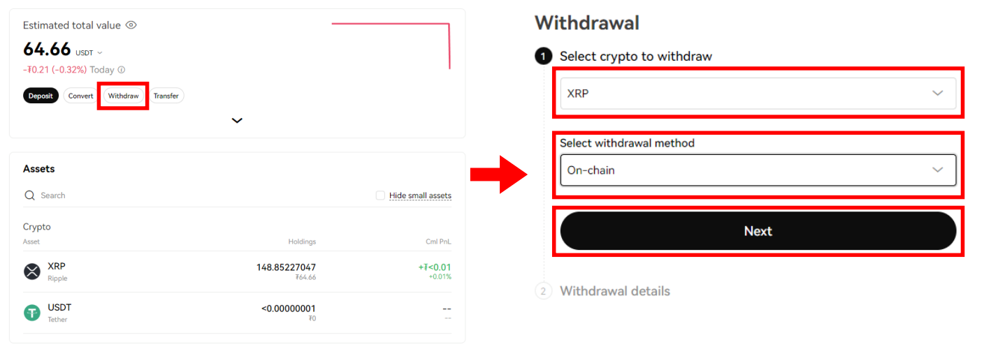 지갑 화면에서 'Withdraw' -> 'Withdraw crypto'를 누른 뒤 'XRP' -> 'On-chain'을 눌러줍니다.